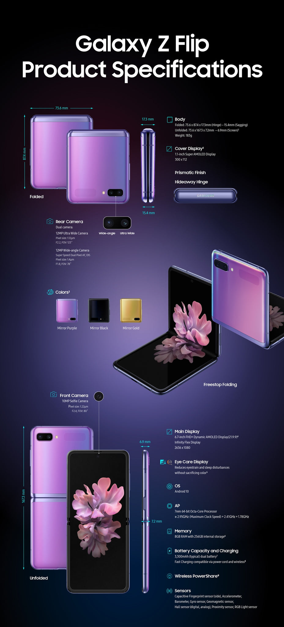 Galaxy Z flip offers a powerful new way to multitask, watch videos, play games, and more – bringing to life new experiences and possibilities years in the making. When Galaxy Z Flip unfolds, it can stay open at multiple angles, unlocking opportunities for selfies that show more of the world around you and expressive video chats – all hands-free.